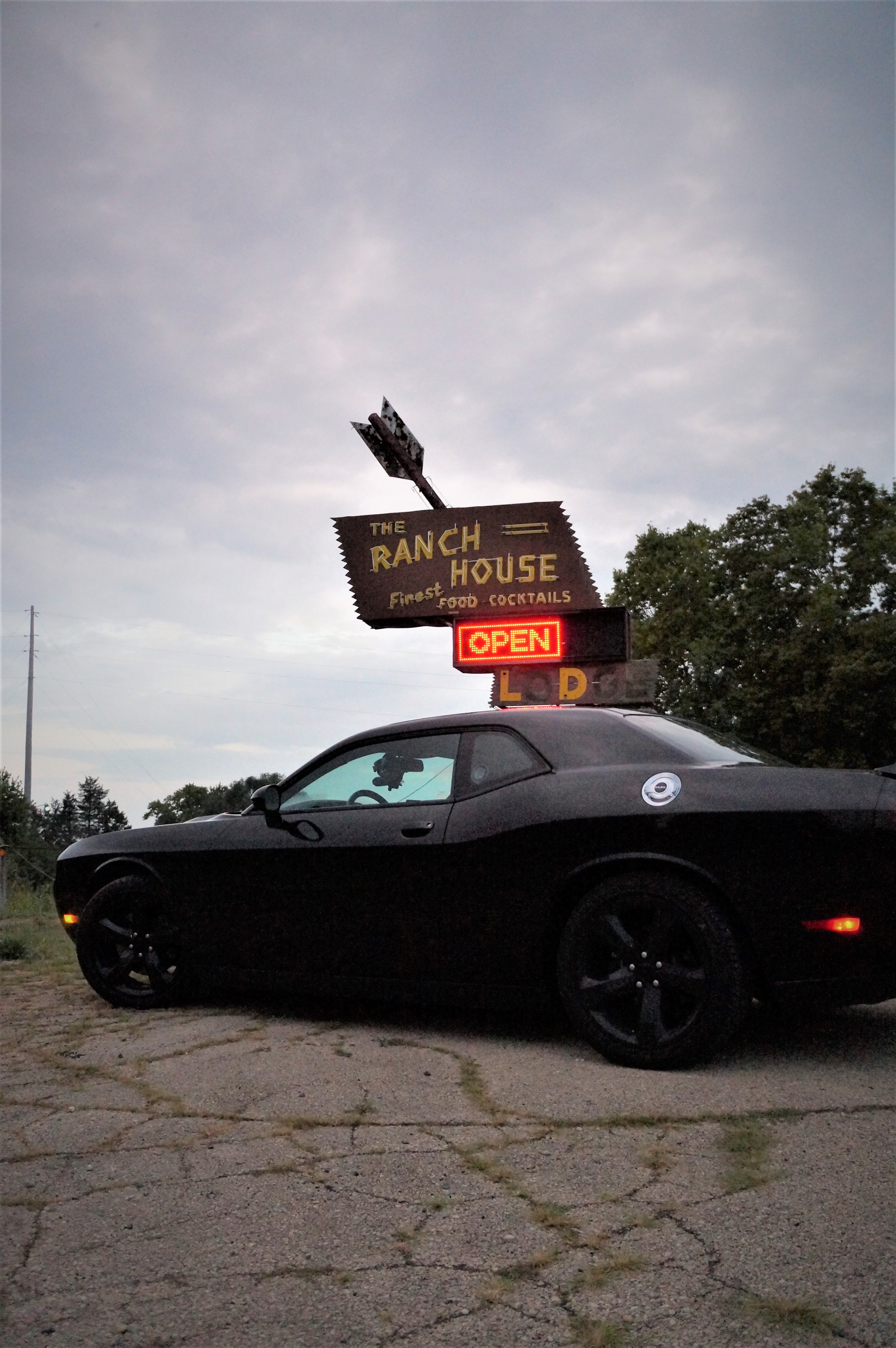 off the back roads with Noah's Dodge Challenger. The sign reads, "The